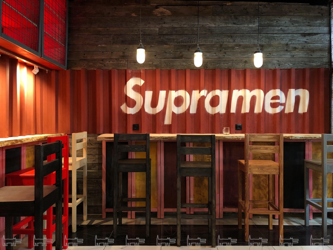 Supramen — первый самостоятельный проект поваров Кирилла Сафонова (отвечал за кухню спикизи-бара Kabinet) и Виктора Шляктенка (был су-шефом у Павла Демина в ресторане Volna). Лапшу делают сами из обычной пшеничной муки высшего сорта по рецепту, найденному и переведенному с японского с помощью Google. Она выходит неаккуратной, но это и не нужно, когда весь концепт заведения — треш-андеграунд, а стиль оформления высмеивает хайпбистов и их любовь к брендам.