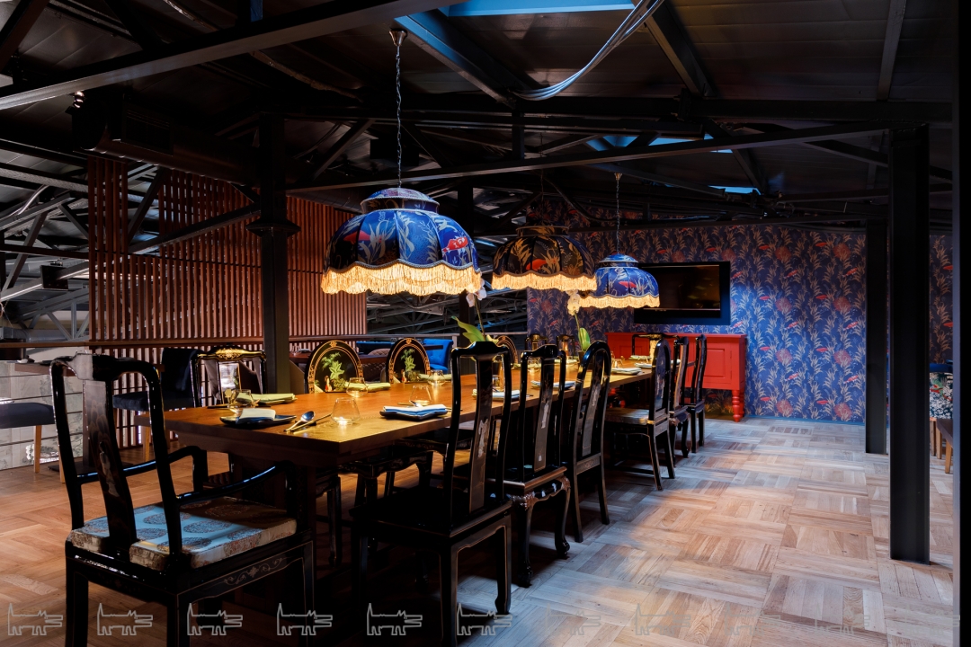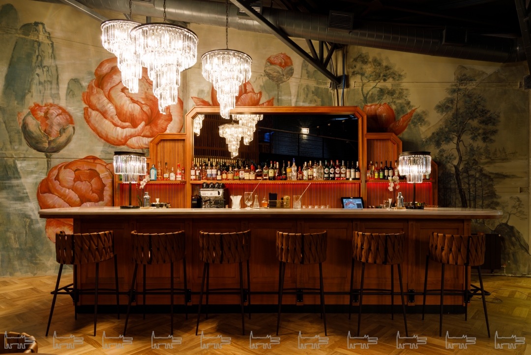 «Мы вынашивали эти образы полгода в голове, и, когда начали работать над проектом, сразу представили четыре контрастных пространства, в которых пересекаются традиции, культуры, взгляды и даже время. Хотели воссоздать Азию во всех ее проявлениях. Дизайн родился вместе с самой концепцией, и в итоге все сложилось из деталей: привезли стулья в стиле шинуазри из Бельгии, нашли антикварные диваны, специально заказали обои с дизайнерским принтом, подобрали ткани для воздушных полотен в зоне чайной, которую сейчас достраиваем, собрали поштучно ретро-рамки по всему Петербургу. Небольшие элементы объединяет роспись по стене: пышные пионы, азиатский хвойный лес, переходящий в тропики, – это работа студентов из академии Штиглица. Ребята трудились и днем, и ночью. Это Георгий Першин, Семён Малышев, Елена Хасанова и Винер Ишмаков».