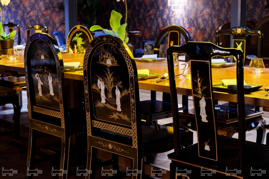 Основное пространство – ресторан с высокими потолками и видом на улицу – бывший двор-колодец, декорированный китайскими фонариками. На втором этаже Mandarin Square открыли квартиру для мероприятий в стиле апартаментов состоятельного мандарина (китайского чиновника): винтажная мебель, обои и абажуры с орнаментом, фотографии азиатских див в тяжелых антикварных рамах и приглушенный свет.