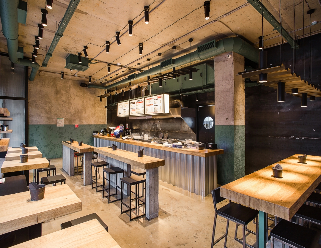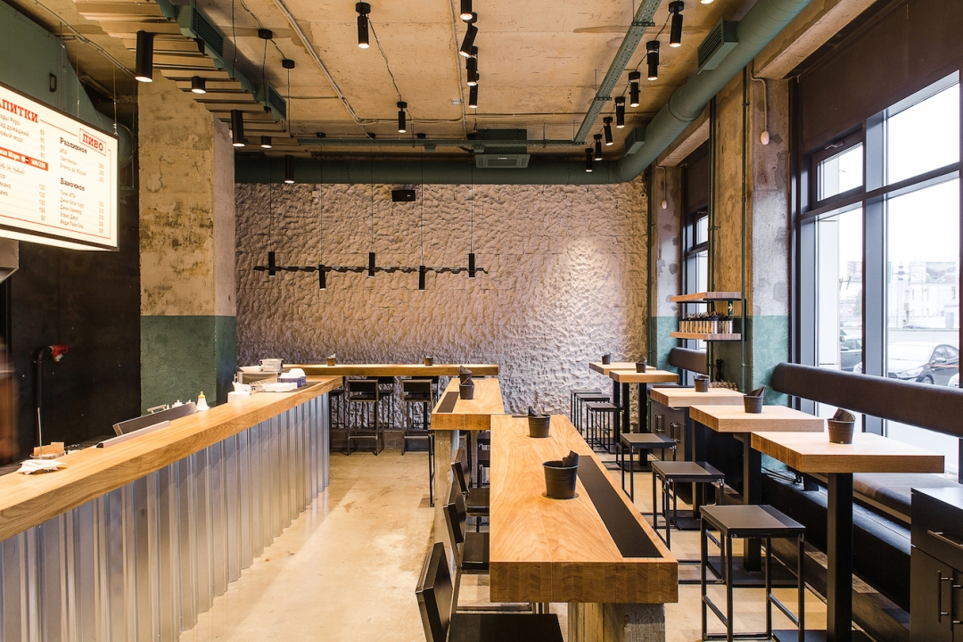 Внутри 30 посадочных мест и открытая кухня. Интерьером занималась команда DA architects – здесь много дерева, металла и бетона.