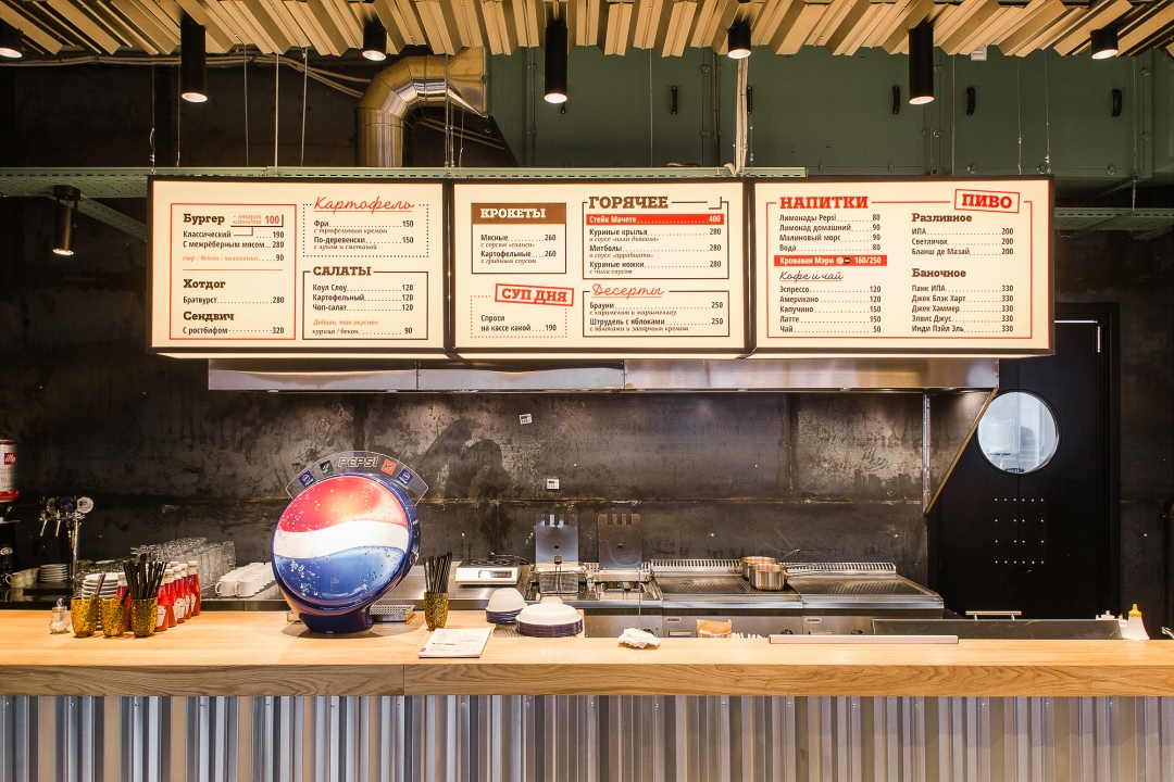 Коктейли разливают из кегов: «Кровавую Мэри», например, подают прямо из черепа. В конце ноября на краны поставят вино и крепкие напитки. Все блюда можно заказать с собой. Бренд-шеф «Забегаловки» — Илья Бурнасов (Hitch, Locale, «Ателье. Tapas&Bar»), шеф-повар — Тимофей Кузнецов (Hitch, Apres Ski).