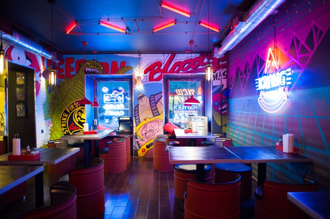 В интерьере — восьмибитные игры из 80-х, тематические граффити на стенах в виде черепашек и злодеев из 80-х игровые автоматы и приставки.
