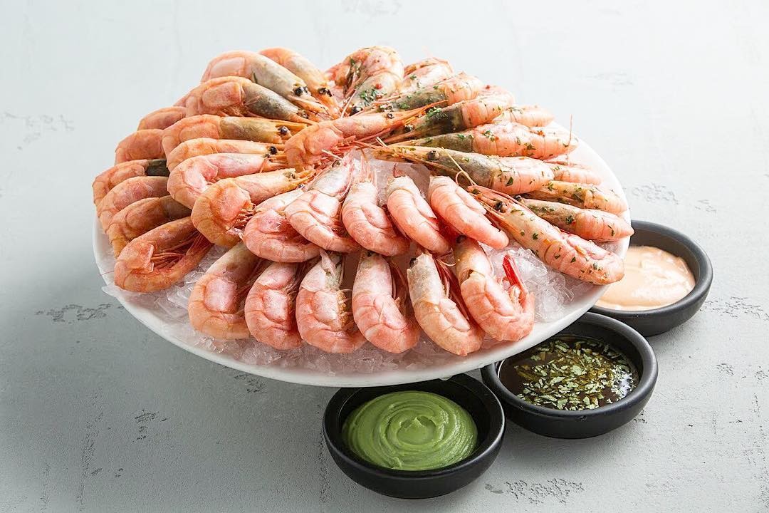 Основная закуска — сморреброды: с сельдью, шпротами, скумбией, подкопченной форелью, печенью трески и с кальмаром и печеными томатами и перцем. На льду подают фирменнное плато из креветок — копченые, маринованные и отварные.