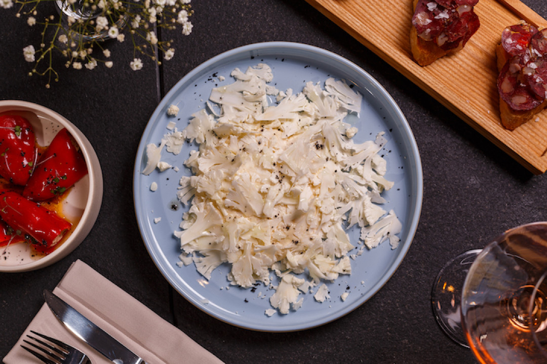 Охлажденная цветная капуста приятно похрустывает, к ней – мусс из пармезана и несколько капель трюфельного масла – идеальная закуска, которую удобно заказывать в стол.
