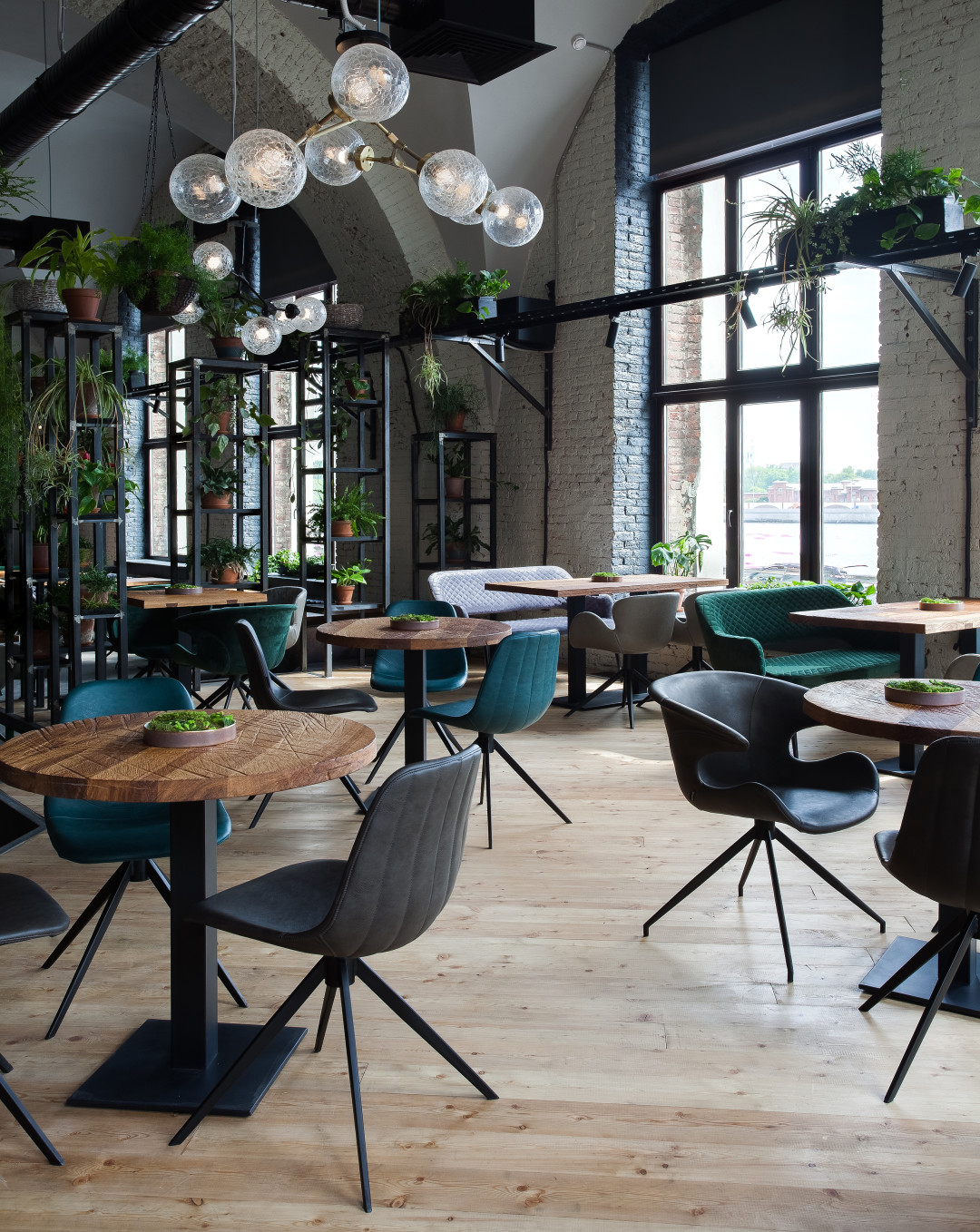 Интерьер на площади 500 м² придумывали без помощи дизайнеров, индустриальное прошлое подсказало, что делать: сохранили исторический кирпич, только выкрасили его в белый цвет, оставили на виду металлические конструкции и все это разбавили деревянными поверхностями и большим количеством растений. Пространство зонировали — выделили магазин морепродуктов, ресторан, бар, отдельный зал с каминами и большой ивент-холл, где обещают проводить концерты.