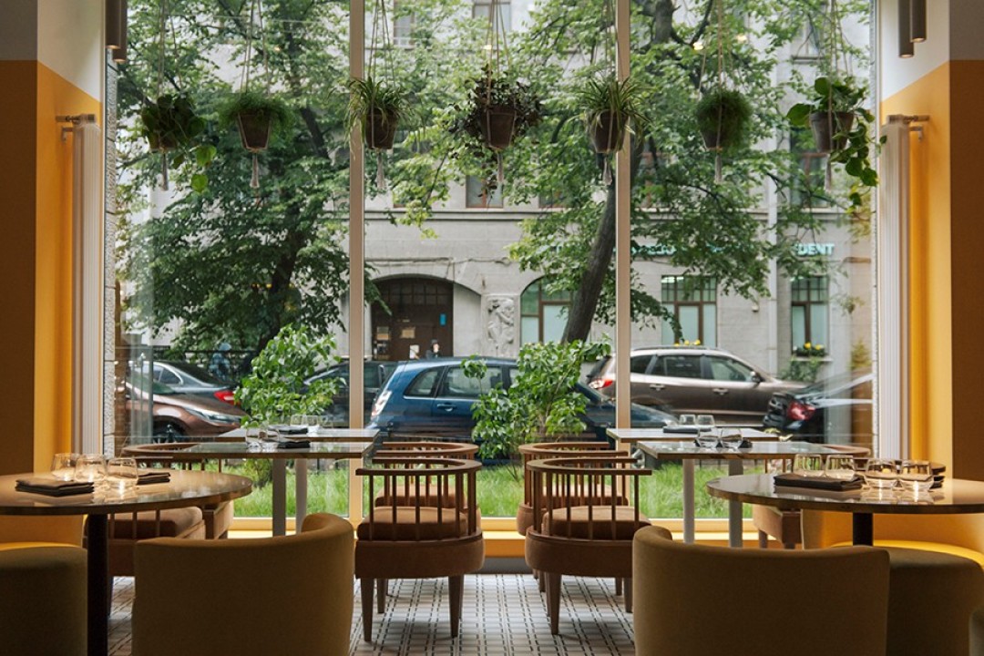 В интерьере – дух городских джунглей: открытая кухня, панорамные окна, обилие цвета и живых растений. Созданием дизайн-концепции занималась основательница L.A.M. buro (Union, Дикman's Deli, The Hat) Люба Рогозина. Графический дизайн для заведения делал Родион Серебренников.