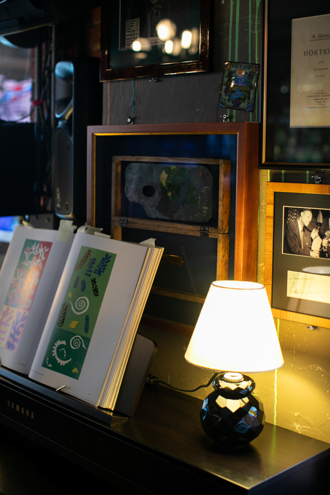 Декорировать интерьер и превратить его в арт-кафе основателям помог архитектор Антон Горланов. Стены украшают репродукции титульных картин великого француза Анри Матисса, среди которых «Танец» и «Музыка», фотографии с автографами Дэвида Боуи, Тома Джонса, The Rolling Stones и оформленные в паспарту вырезки из раритетных газет «Женский журнал» 1928 года и Time 1960-1961 гг. В списке экспонатов рестобара имеется и книга Матисса «Джаз», для которой фовист вырезал фигуры из цветной бумаги, создавая иллюстрации в технике декупажа. Для подкрепления богемной атмосферы в зале устроена небольшая сцена для музыкантов и диджеев – последние по выходным крутят винил.