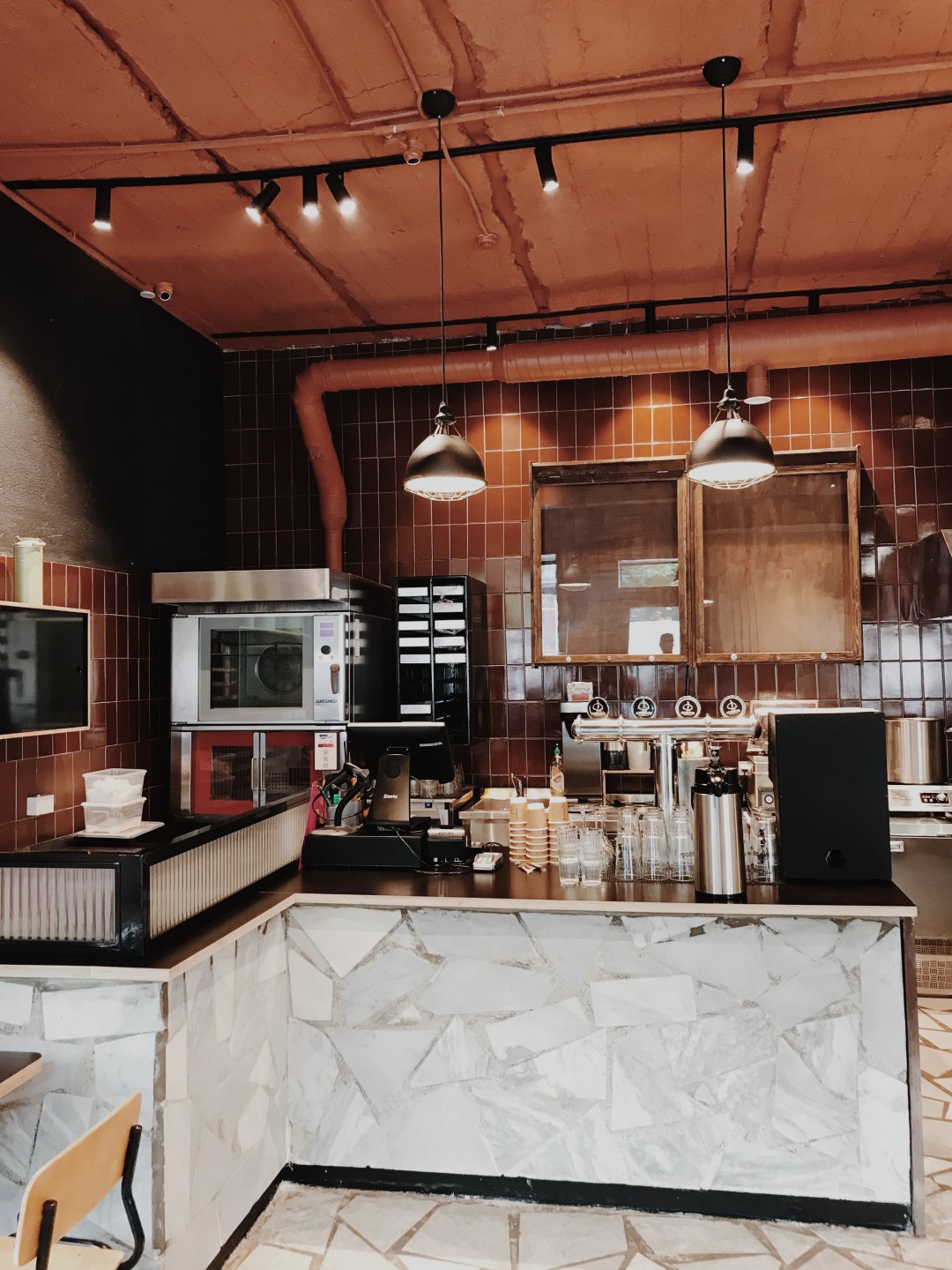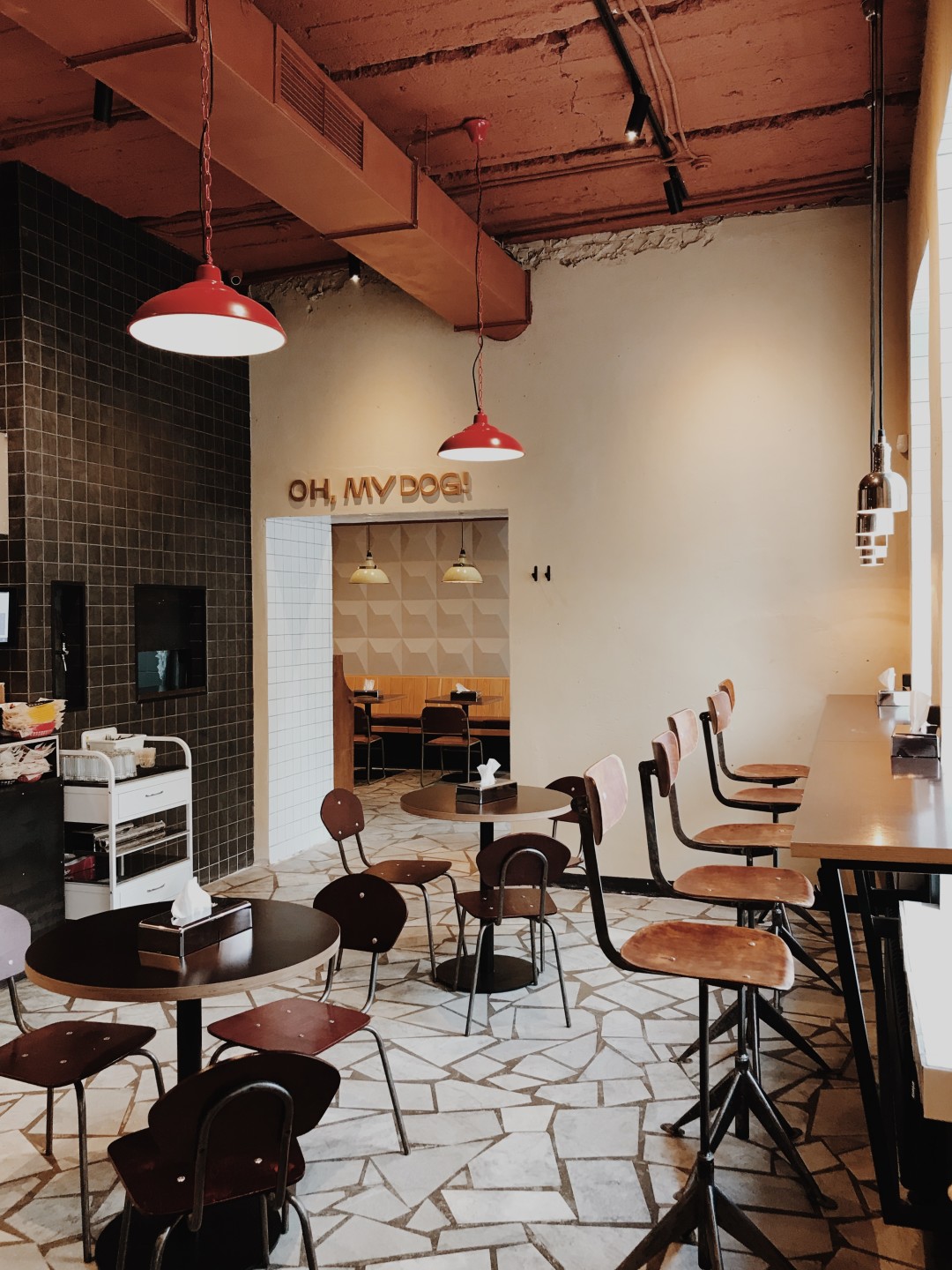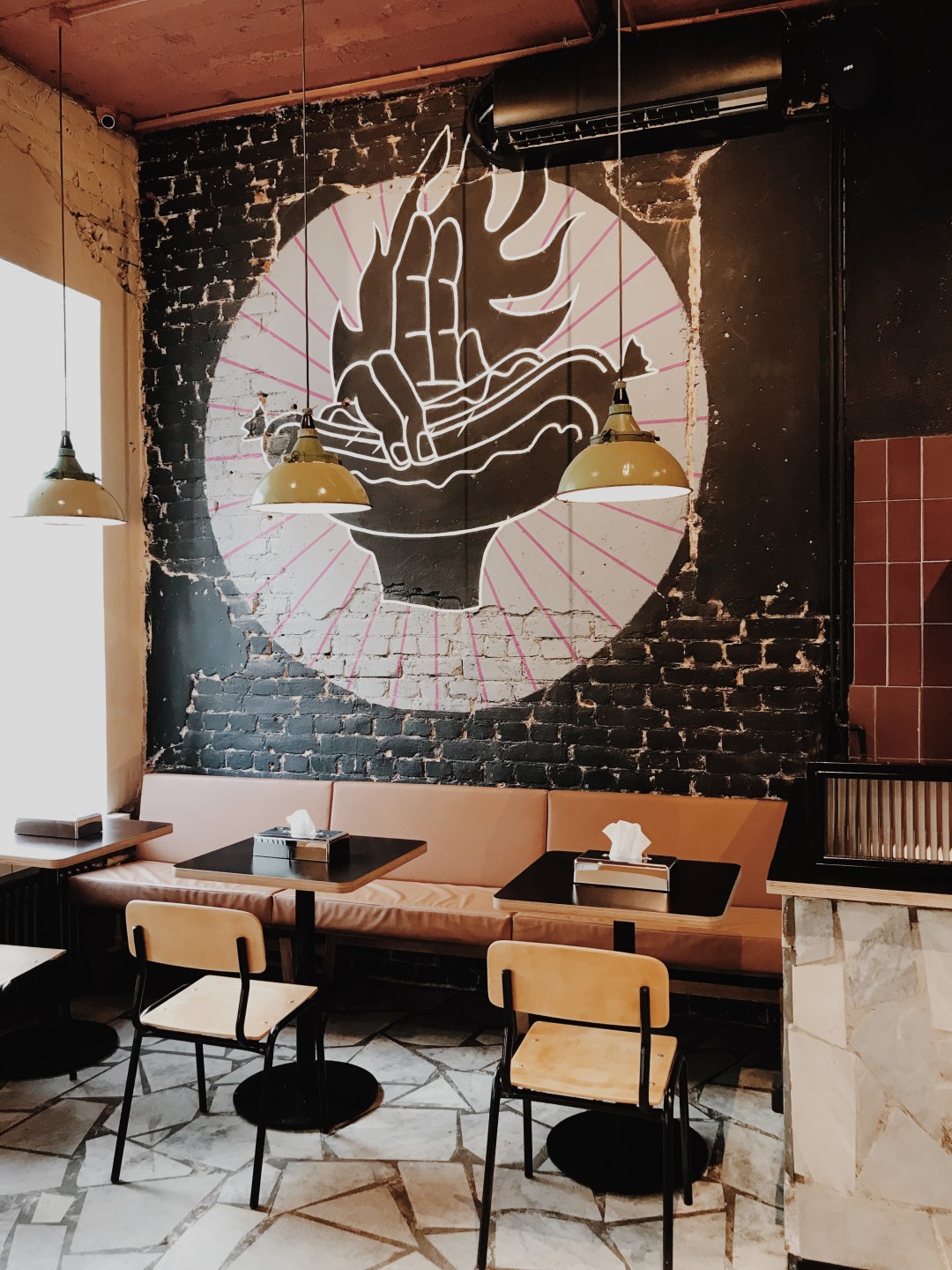 Интерьер кафе на 40 посадочных мест выполнен в эстетике скандинавского минимализма с отдельными яркими деталями, вроде масштабного граффити с изображением хот-дога в одном из залов.