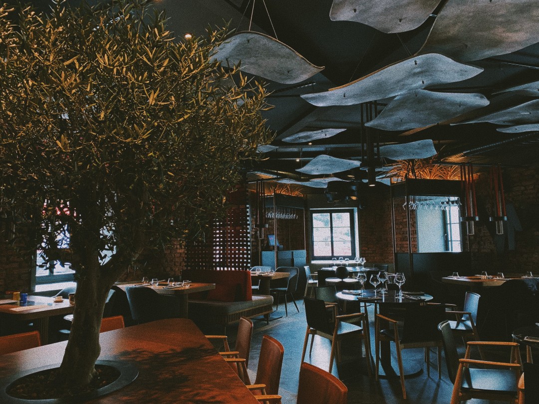 В ресторане три зала, рассчитанных на 150 посадочных мест. Ставку дизайнеры сделали на сочетание натуральных материалов – в частности, дерева и живой зелени – с металлом и камнем.