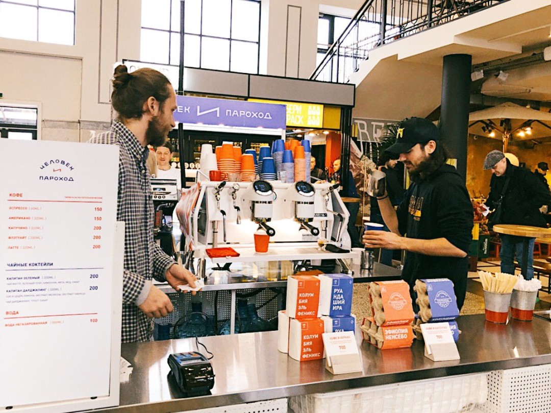 Московская кофейня «Человек и пароход» запустилась на Василеостровском рынке. На фудмаркете готовят кофейную классику и чайные коктейли, а также продают собственные бленды кофе (в том числе – в капсулах).