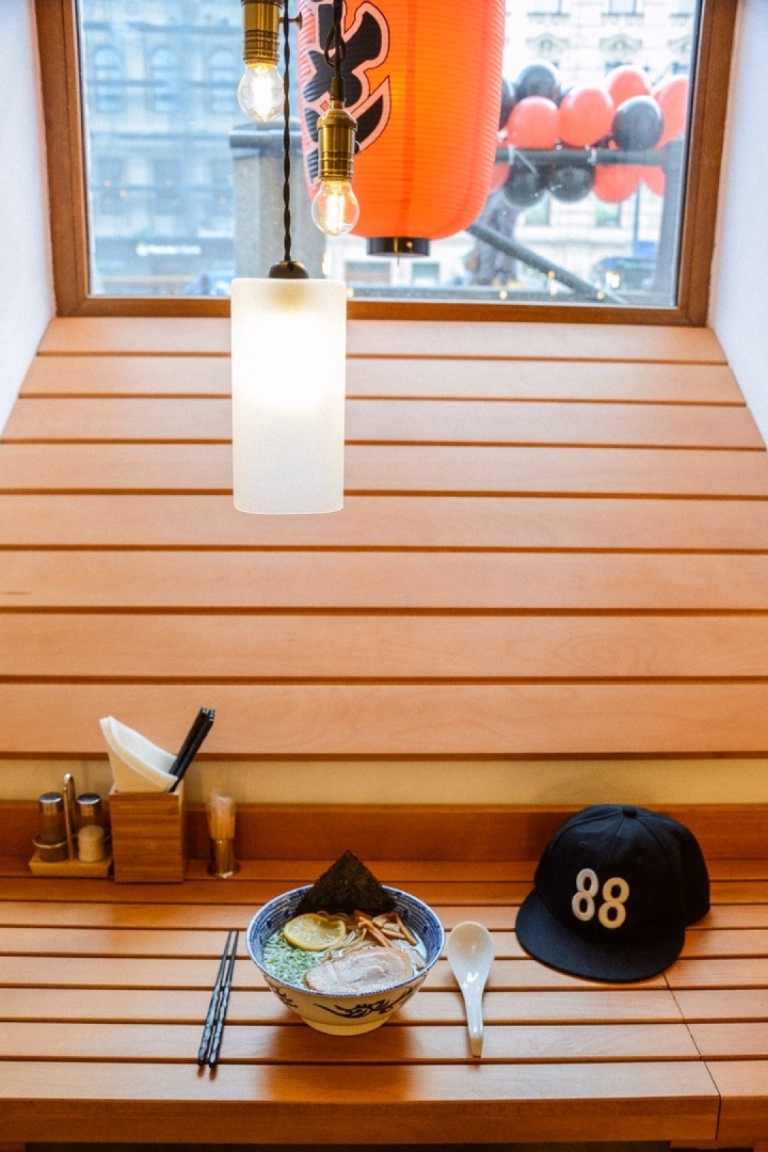 Основа меню — рамен. Посетителям предлагают более десяти вариаций супа: есть как традиционные – с курицей или свининой, так и, например, с рыбой или веганский вариант – с бурыми водорослями вакамэ. Помимо раменов в кафе подают карри и доны, а с 12:00 до 16:00 предлагают комплексный обед из трех блюд за 700 рублей.