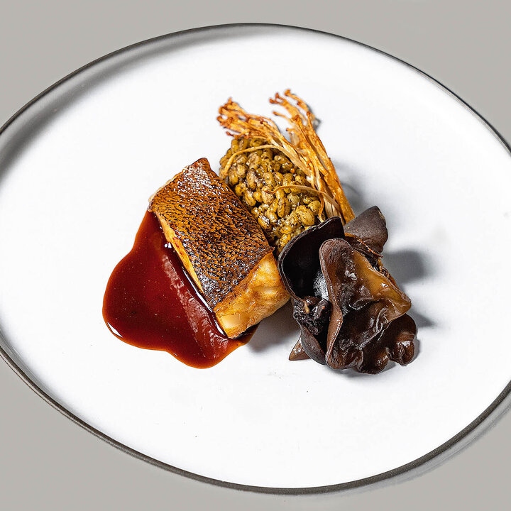 - Выложите на тарелку ложку голландской каши, рядом — грибы эноки. Сверху на кашу аккуратно выложите палтус хрустящей кожей вверх.