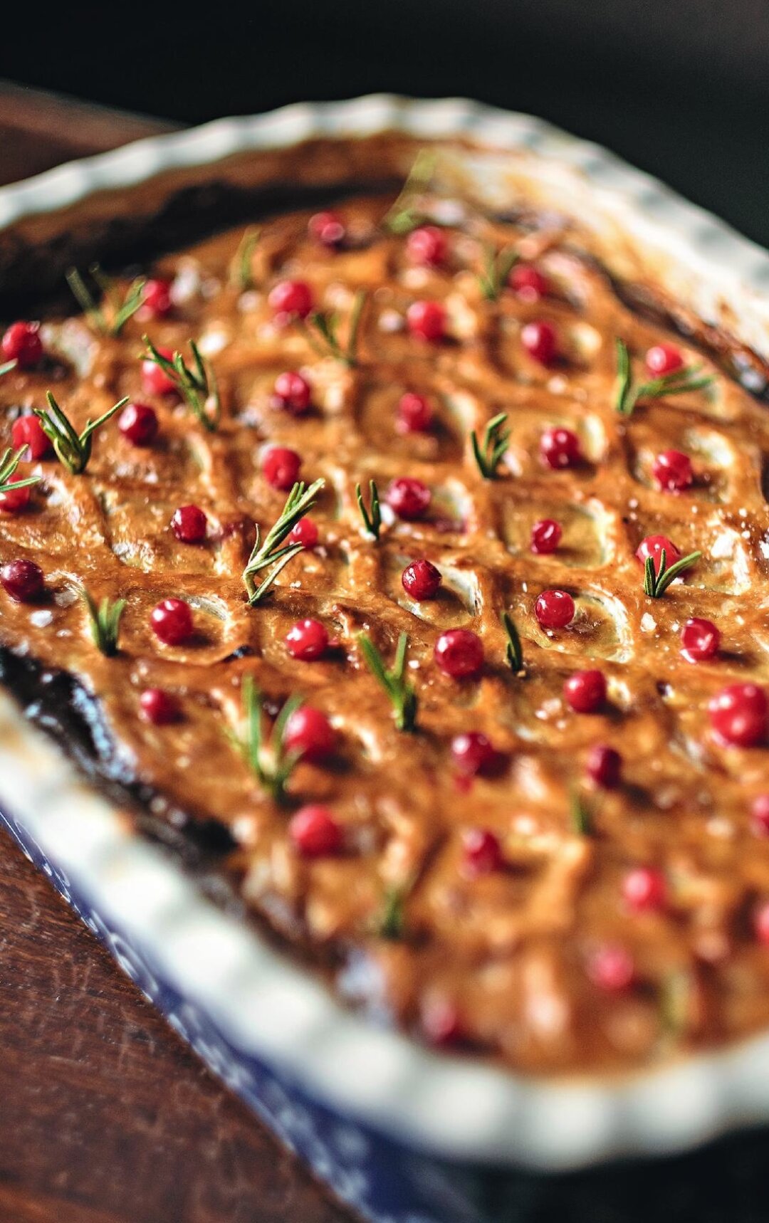 7. Готовый пирог украсьте ягодами брусники и веточками розмарина. Подавайте горячим.