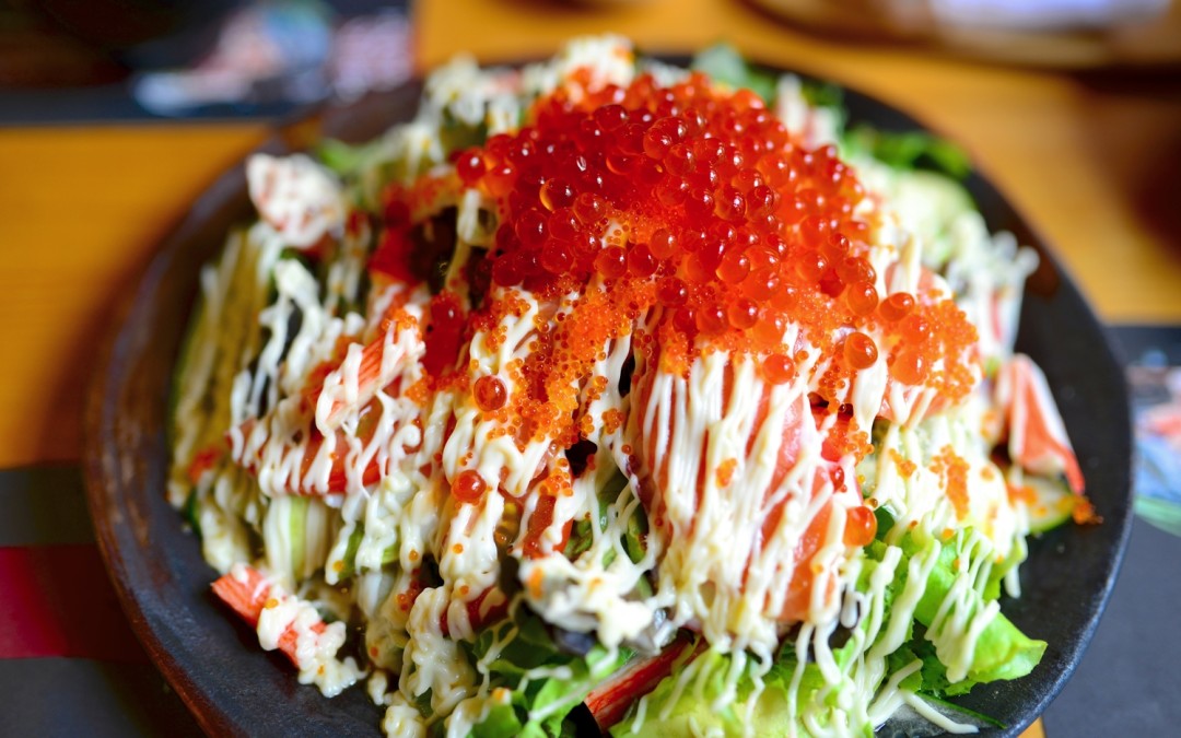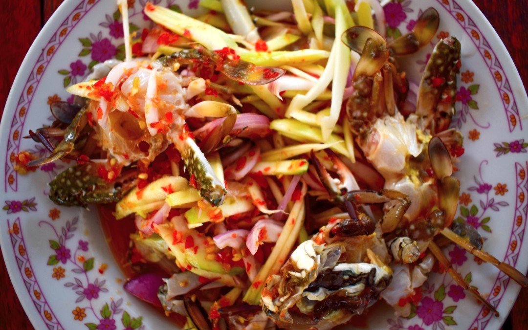 Мясо фаланги краба, свежий огурец, манго и помело нарезаем соломкой, смешиваем и добавляем крабовый айоли. Сверху поливаем соусом на основе пюре из манго и сока юзу и украшаем щучьей икрой. Немного концентрации – и все гости будут удивлены вашему мастерству добывать правильный сок юзу и извлекать мясо из фаланги краба.