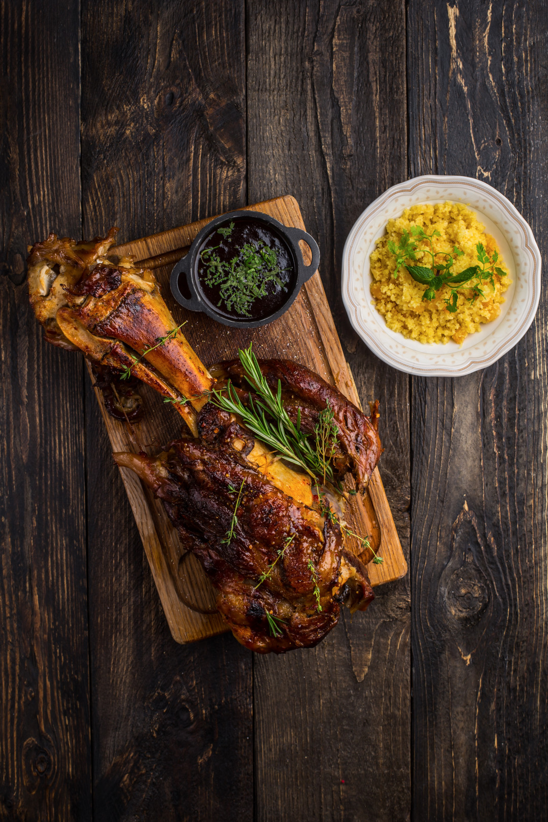 Тимьян, розмарин и чеснок измельчаем в крошку, смешиваем с солью, медом, аджикой и натираем голень. Маринуем в течение 2-3 часов в холодильнике. Заворачиваем в рукав для запекания и отправляем на 2 часа 15 минут в духовку, разогретую до 125-130 градусов. Аккуратно вынимаем голень из пакета и подрумяниваем в течение 10 минут при температуре 180 градусов. На оливковом масле прогреть тимьян, розмарин, чеснок, добавить красное вино и выпарить его на 2/3 на медленном огне. Затем добавить мед, соус барбекю и основу для соуса демиглас (желательно финского производства). Довести до кипения на медленном огне, процедить, добавить сливочное масло и дать соусу настояться. На оливковом масле обжариваем чеснок, сухофрукты и орехи, добавляем запаренный в кипятке кускус, продолжаем немного обжаривать – не забудьте немного соли и перца. Накрываем крышкой и даем настояться минут 5. Наконец все – можно подавать к столу!