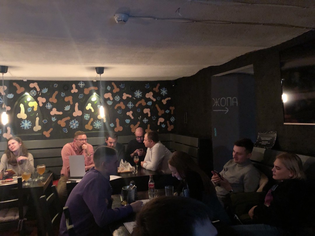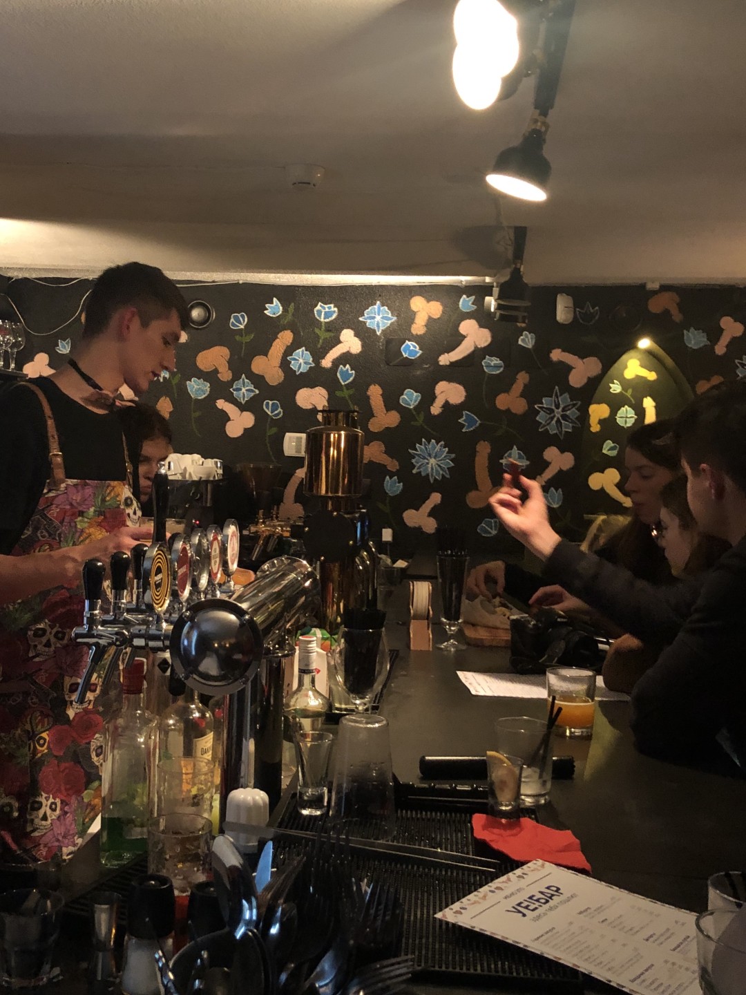 Мы встречаемся у входа в «Уе!Бар» около 23:00. Спустившись по лестнице попадаем в подвальное помещение c наскоро сделанным ремонтом: выкрашенные в черный стены с узором из пенисов и цветочков и простая икеевская мебель. Народу битком — даже у стойки почти нет места. Люди заходят примерно каждые три минуты, оценивают обстановку и уходят, понимая, что ждать столик придется долго. Пробиваемся к стойке.