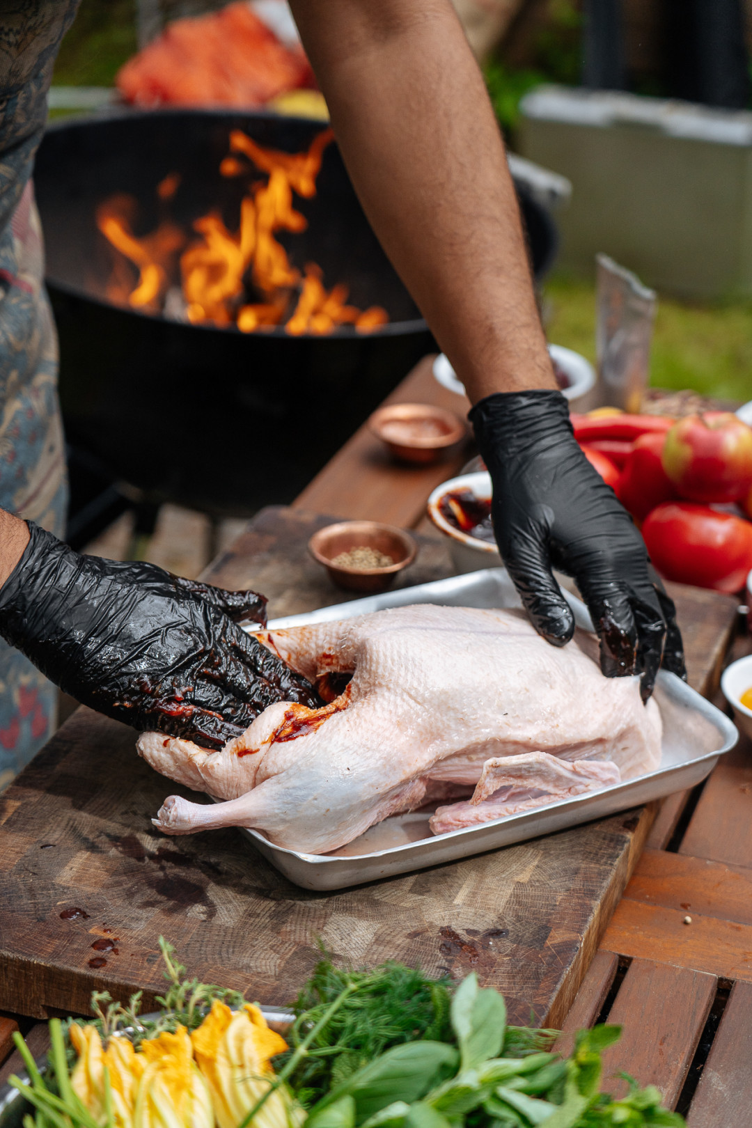 Разделываем птицу и подаем с фирменным соусом BBQ или чимичурри.