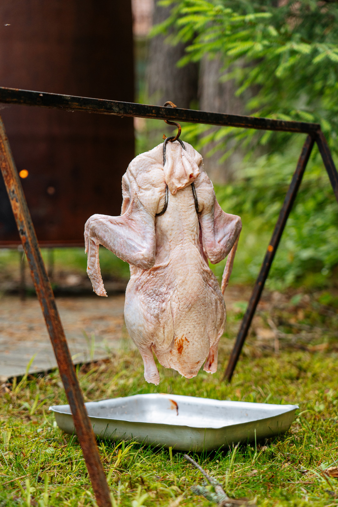 Мастерим крепкий крючок и подвешиваем на него под крылья птицу над поддоном на веревку или штангу. Нужно, чтобы кожа у утки высохла: влажной она будет активно вбирать дым и становиться токсичной.