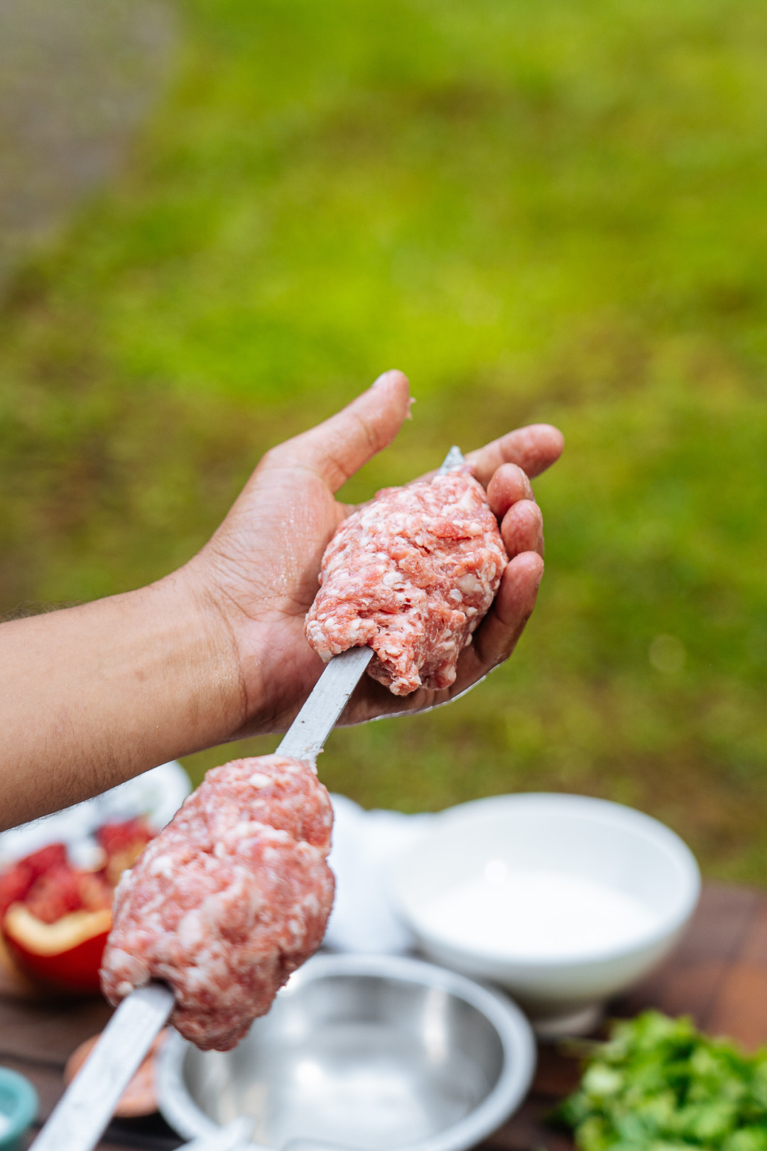 Мелко-мелко рубим лук, соединяем с фаршем и делим его на колобки по 50 грамм. Фарш должен быть максимально холодный, но не замороженный, а рядом с вами — миска с почти горячей водой: если руки будут сухие, то жирное мясо на них налипнет. Поэтому перед тем, как облепить фаршем шампур, каждый раз опускайте ладонь в теплую воду — и не забудьте рядом тряпку, чтобы протирать руку между подходами. Формуя кебаб в длинную колбаску, защипите ее сверху и снизу, чтобы при жарке не растерять соки.
