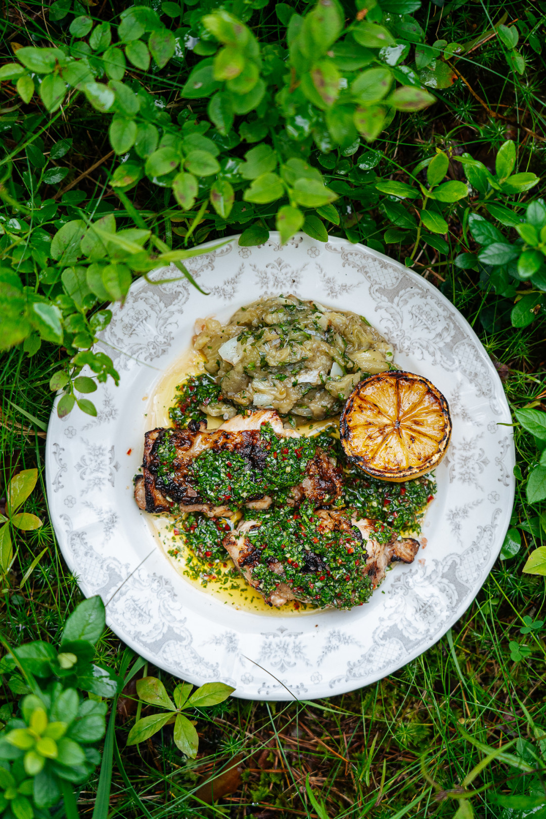 На тарелку выкладываем курицу — крупные куски можно порезать, к ней пюре из баклажанов и обильно поливаем чимичурри.