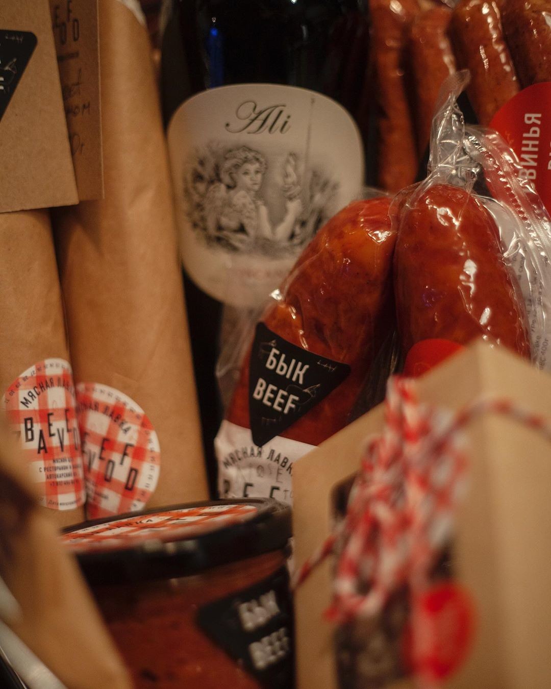 В мясном ресторане BeefZavod к круглогодично собирают корзины с мясными деликатесами собственного производства и вином. Например, корзина с ассорти салями, двумя рийетами из говядины и сердце быка, охотничьими колбасками, краковской колбасой, порцией пикколини и бутылкой вина будет стоить около 5-6 тысяч рублей.