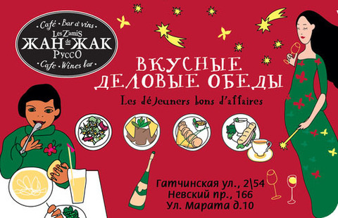 Теперь деловой обед в «Жан-Жаке» на Гатчинской и на Марата можно получить в подарок от заведения: собрав за одну рабочую неделю пять штампов, шестой французский обед из специального меню (которое теперь обновляется раз в 10 дней) выдают бесплатно. Карточки не именные, поэтому можно собирать штампы всем офисом - главное уложиться в одну неделю.