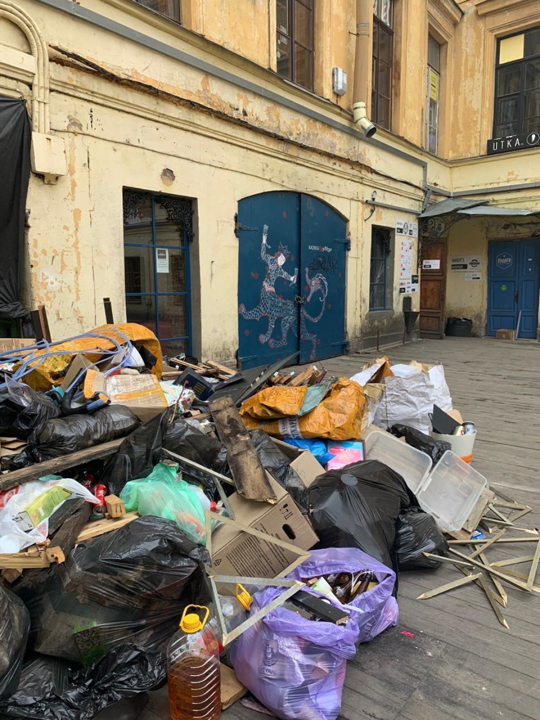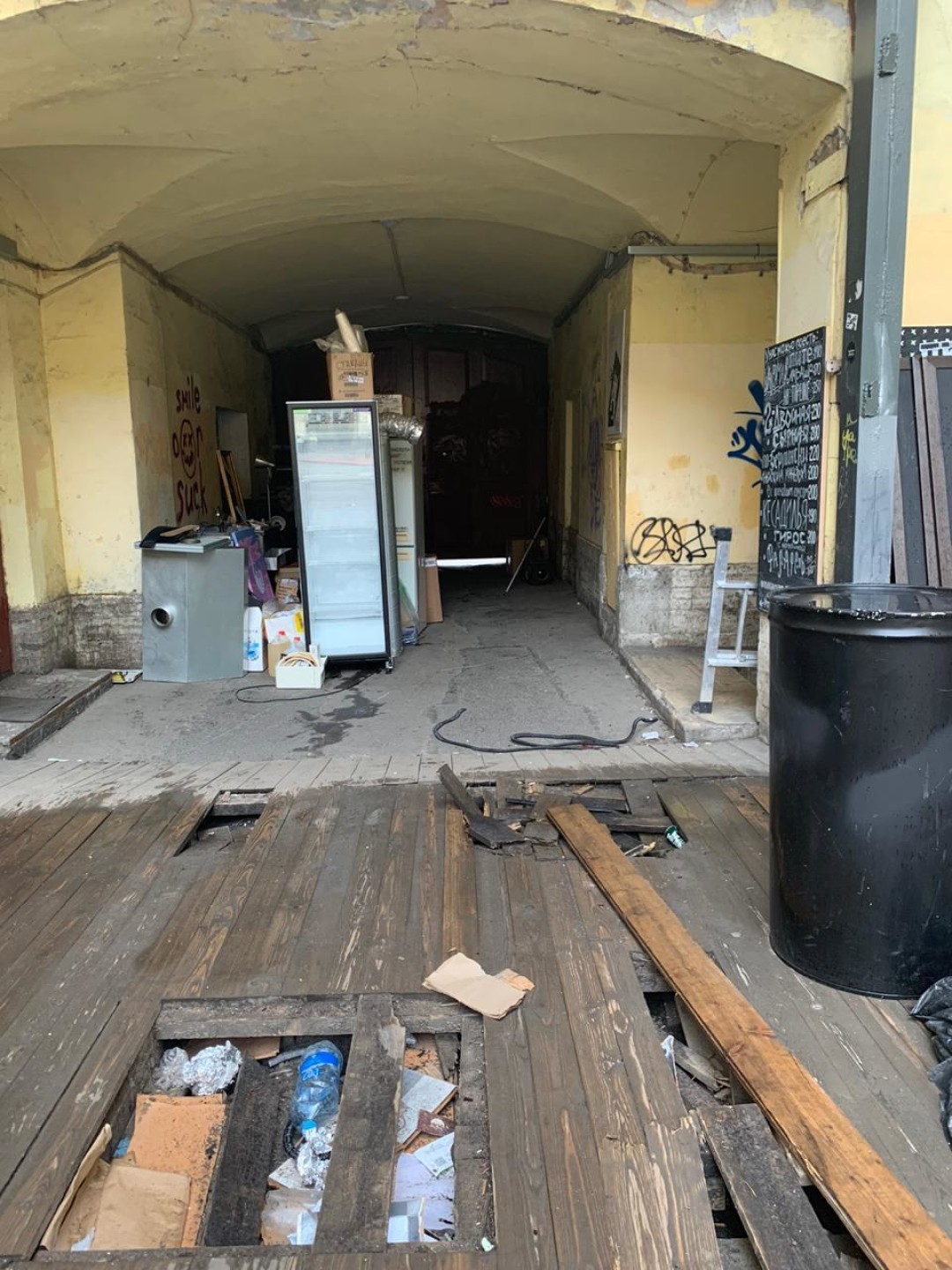Первым звонком стал мусор, который перестали убирать – и он из арки перетек почти на середину двора. Мы смеялись, что скоро не сможем открыть ворота. При этом никакой  информации не было, и когда в кластере стали срезать батареи, срезать электропроводку, снимать щитки, началась паника. Последние пару недель были максимально тяжелыми. Во дворе почти исчез настил. Туда заезжали машины, да и дерево уже прогнило.