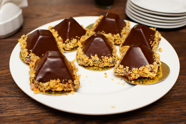 Пирожное «Пуговка» Владимира Бухинника названо в честь декора в виде пуговицы, являющейся символом профессии модельера. Шоколадно-пражский бисквит, сливочно-заварной шоколадный крем, глазурь с декором в виде пуговицы из сахарной пасты. 180 руб.