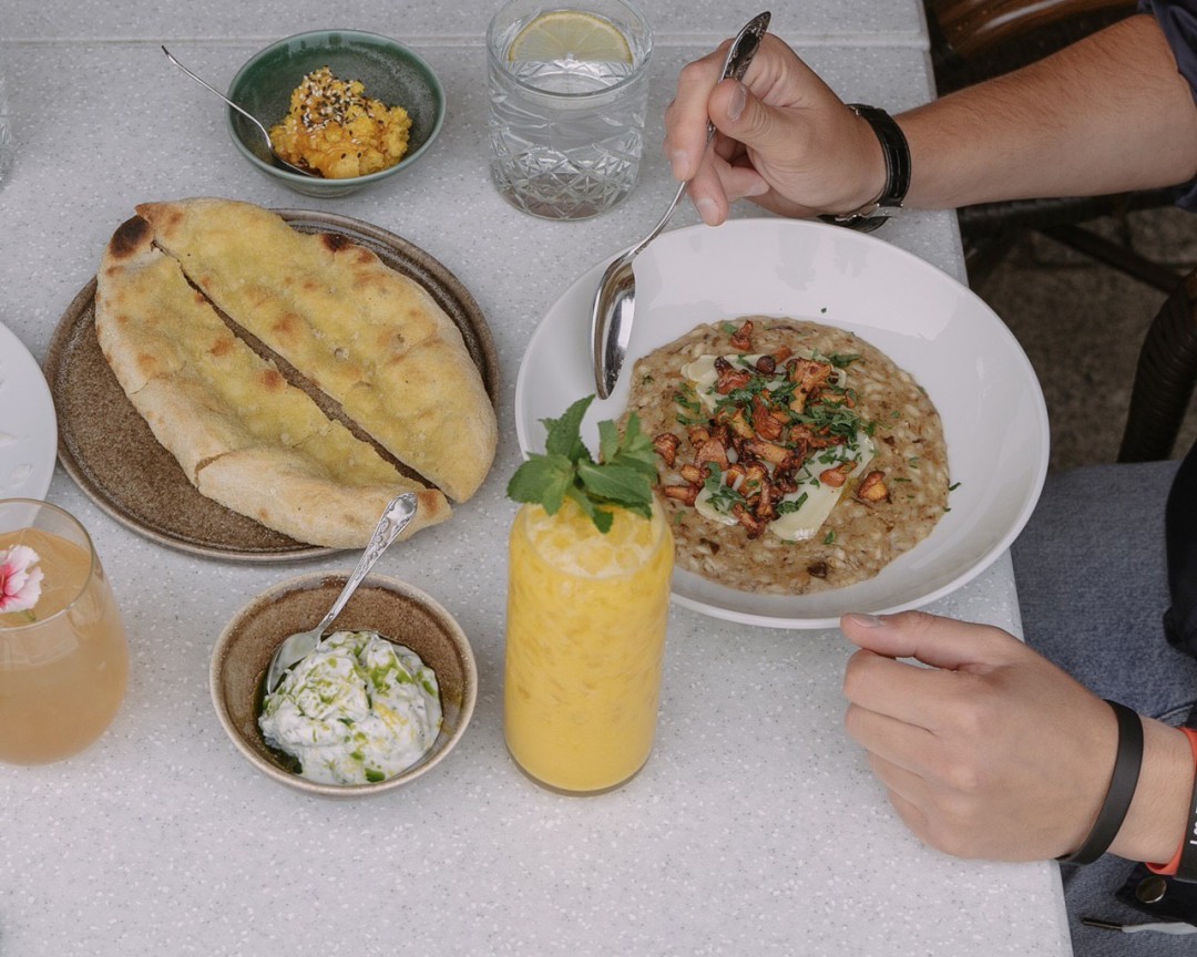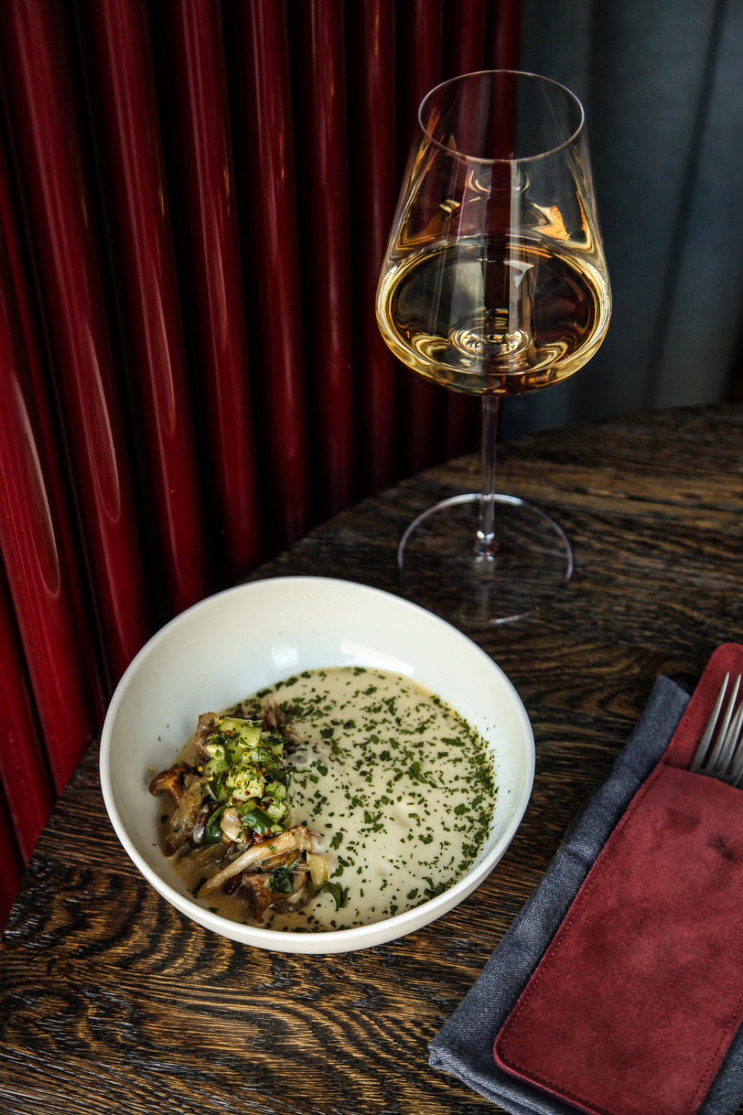 Здесь в сезонном меню очень интересно расставили гастрономические акценты: в классическое сочетание жареных лисичек и картофеля ввели ноту умами — с помощью кешью и огурцов в азиатском стиле, а для любителей суперфудов грибы подают с пророщенной зеленой гречкой — плюс сельдерей и пюре из горошка.