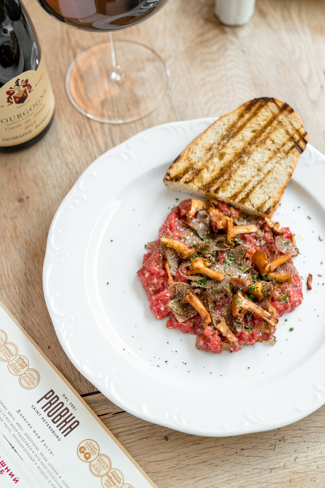 Пицца с лисичками и гуанчиле и тартар с черным трюфелем в Probka