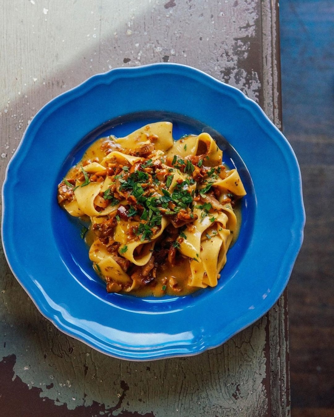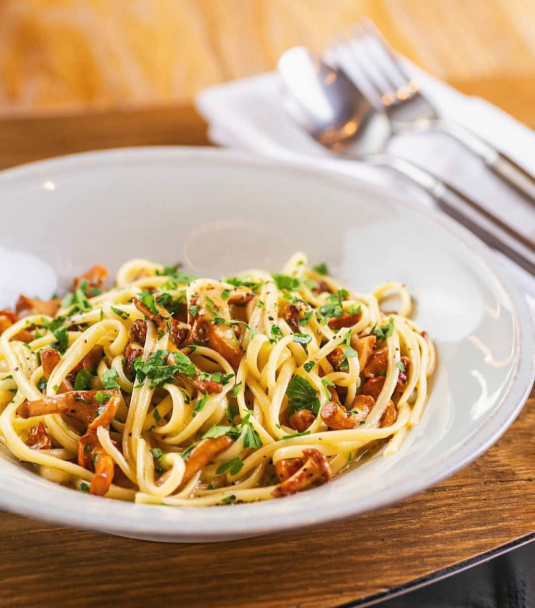 Шеф Антонио Фреза готовит пасту тальятелле из-под ножа и соединяет ее с лисичками и свиными щечками гуанчиале, а на завтрак (с 11:00 и аж до 16:00!) ждёт на скрембл с лисичками и страчателлой. Пицца с сезонным грибом тоже есть — также в её составе французский сыр конте и бекон из говядины.