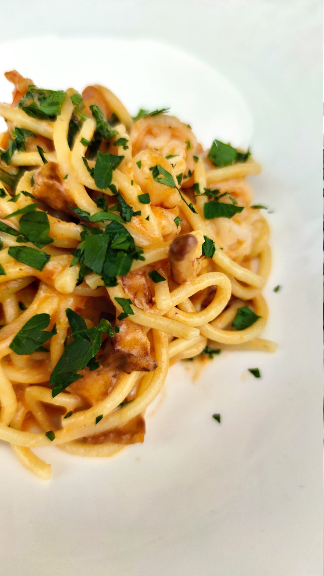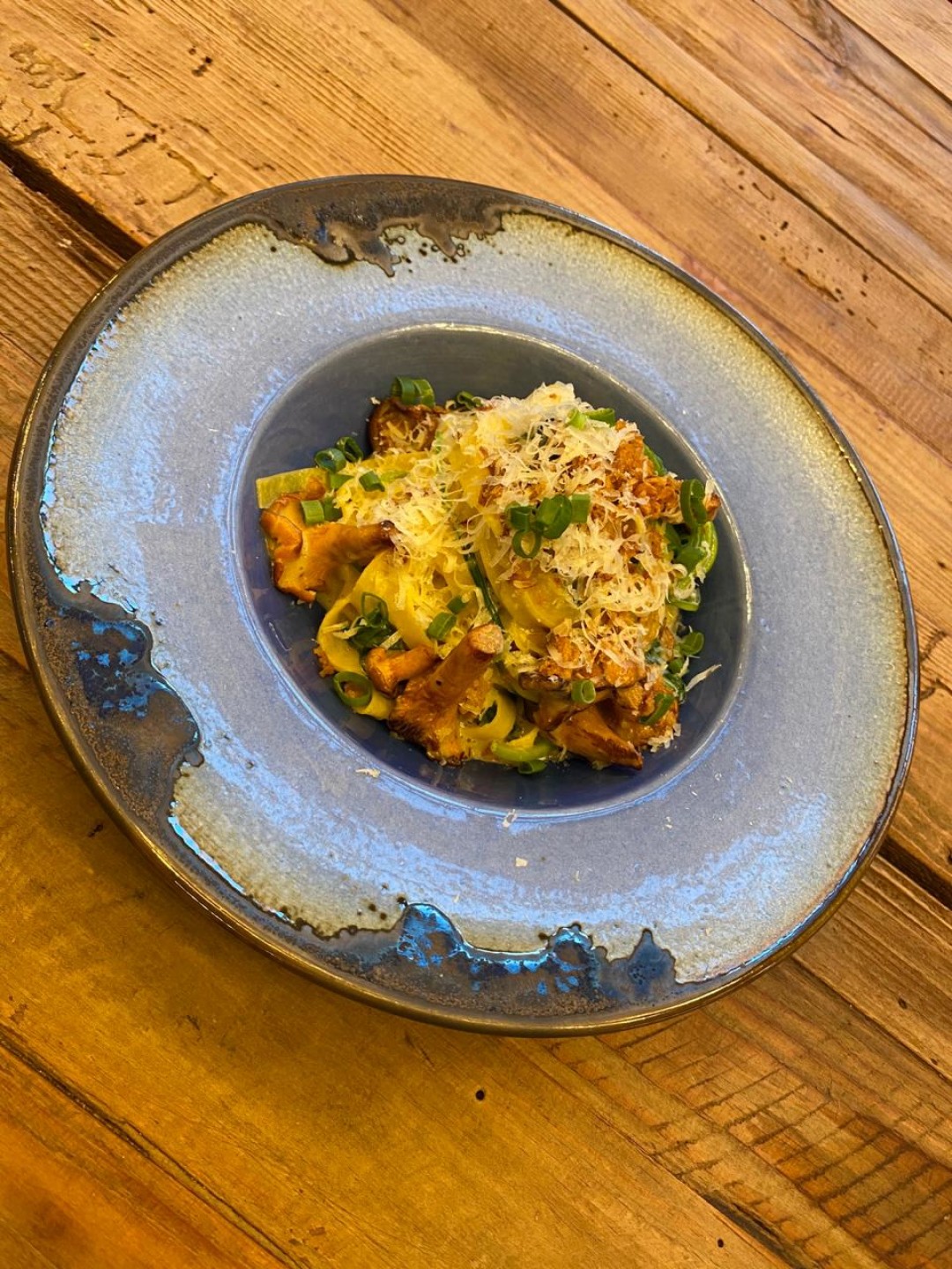 Шеф Игорь Гришечкин добавляет обжаренные лисички в домашнюю пасту, заправляет ее соусом на основе яичных желтков и пармезана и посыпает хрустящим луком-фри.