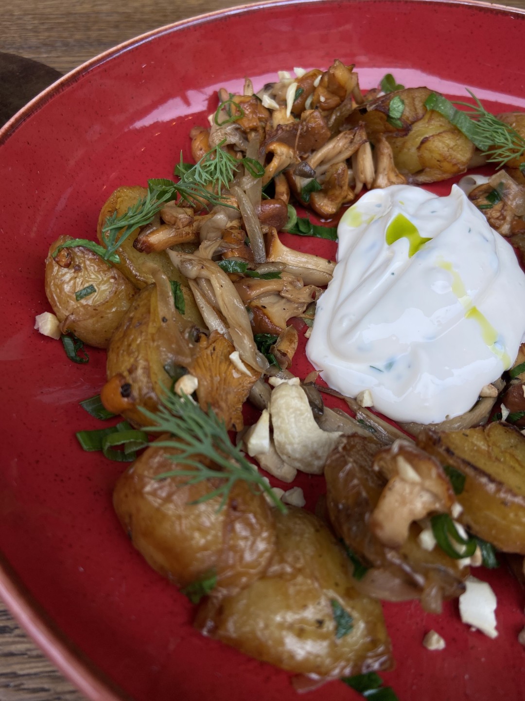 Картошка с грибами у Анны Хмельницкой — очень славная штука по мотивам формата, который был в сети «Крошка-картошка»: грибы в сметане идут в центр большой запечённой картошки, здорово напитывая её соусом. Еще из сезонного — спагетти в сырном соусе с лисичками.