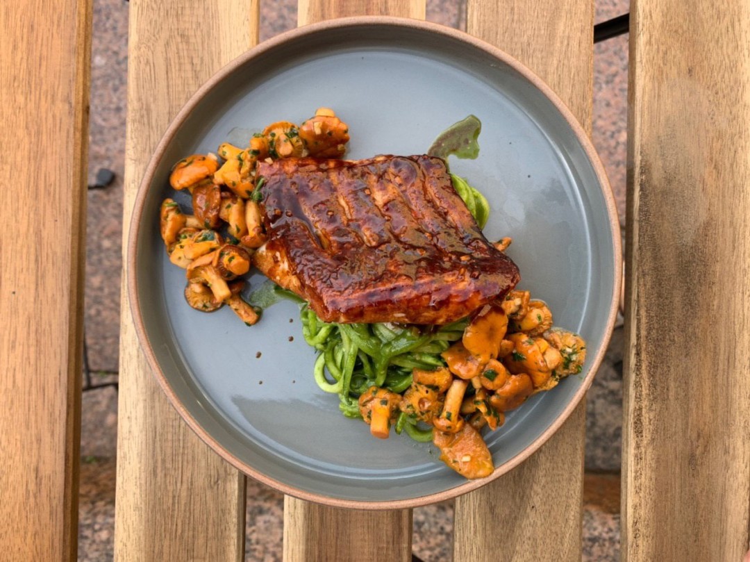 Ресторан команды «Банщиков» в здании Круглого рынка заработал в новом для себя формате уличного кафе, и с 24 июля там тоже ждут на лисички — с морским окунем в азиатской глазури с пастой из цукини или с креветками-гриль и киноа в кокосовом соусе.
