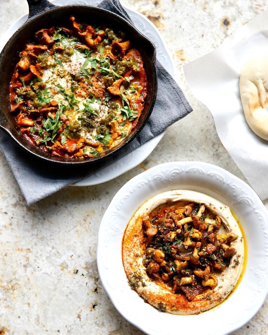 В бистро Saviv лисичек чествуют дважды: обжаренные на дровах их добавляют в фирменный хумус, а также с грибами делают уже ставшую хрестоматийной шакшуку.