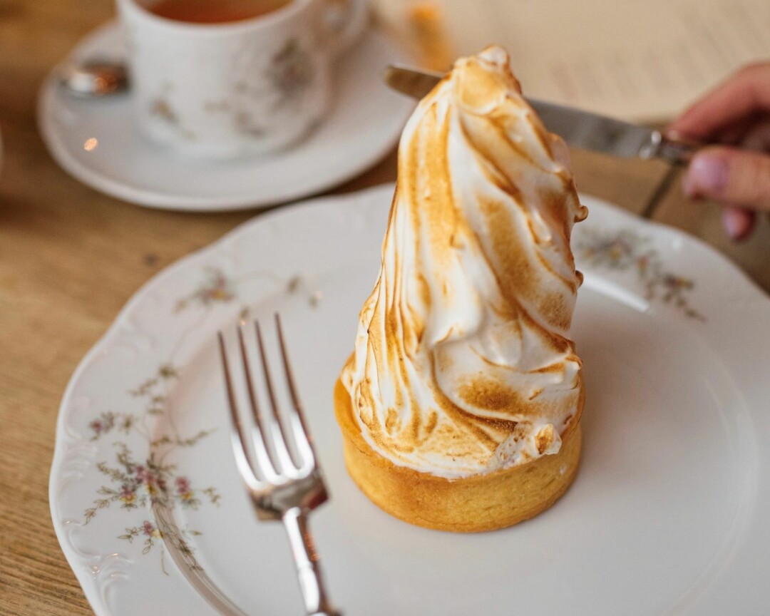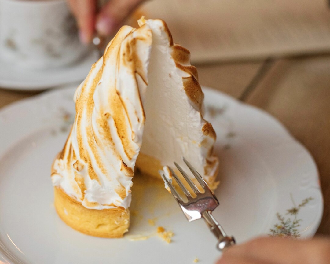 Лимонный десерт с воздушным куполом мягкой итальянской меренги, под которой скрыт деликатный лимонный крем и песочная тарталетка. Кажется, самый фотографируемый десерт ресторана.