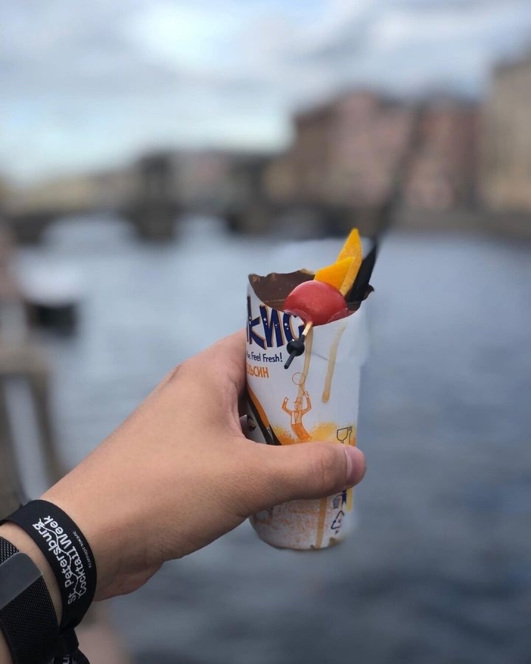 Задание: взять коктейль с собой из любого петербургского бара и сделать на него твист из подручных средств, но обязательно на набережной, у памятника или на поребрике.