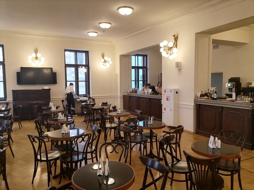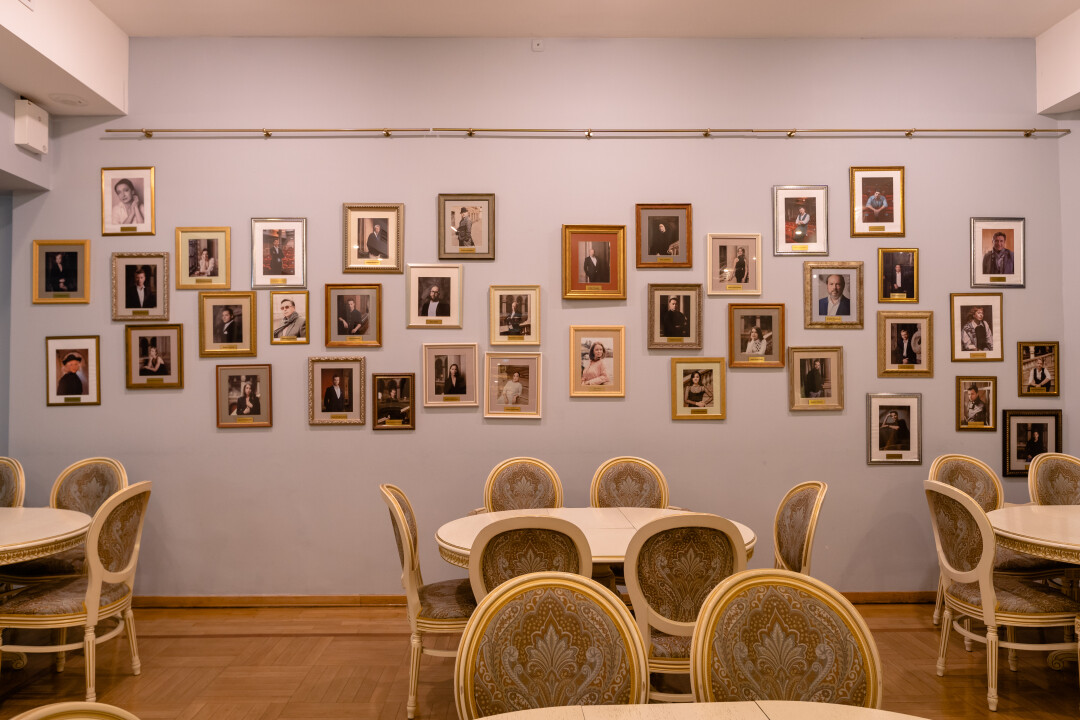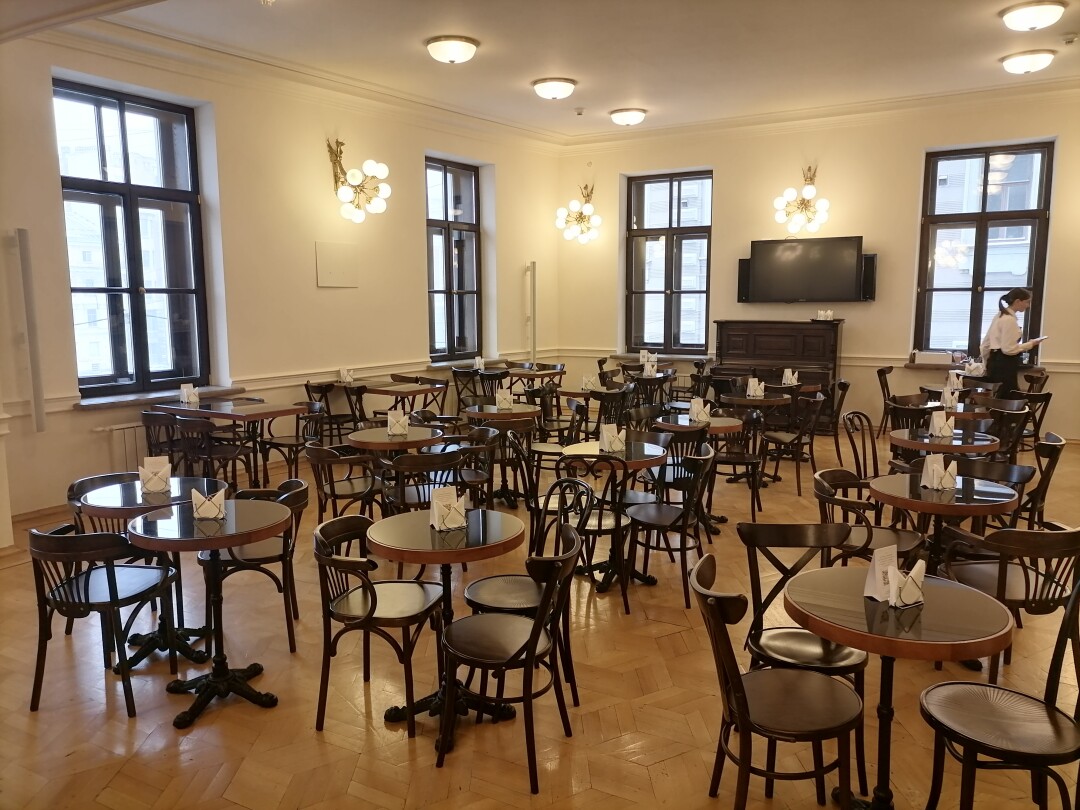 Дизайн нарядного буфета частично сохранен с 1898 года. Есть несколько залов: в верхней части придерживаются классического стиля – круглые белые столы, стулья и скамьи с мягкой велюровой отделкой и французские шторы, а в нижней части – табуреты из темного дерева и портреты эстрадовцев, по центру – бюст верховода — Аркадия Райкина. Must have: эклеры с лососем с игристым вином, пирожное «картошка» в хрустящем шоколаде и десерт «Анна Павлова» вишенкой к венскому кофе.