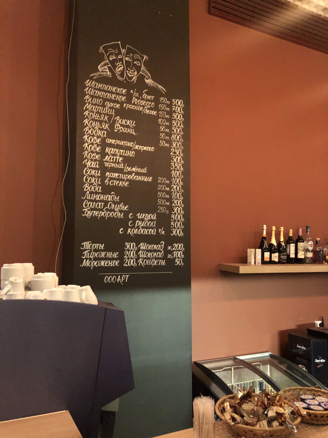 Среди программок, выставленных за стеклом советского деревянного стеллажа, ищем меню. Во-первых, тут одни из самых доступных театральных бутербродов, во-вторых, не заметить запах кофе от рожковой (!) кофемашины — невозможно. К итальянскому кофе советуем брать сорбеты, которые подают тут в стаканчике со вкусами малина-базилик, кокос и даже маракуйя.