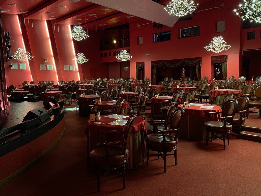 В «Зеркальной гостиной» (малая сцена театра) проходят кабаре-шоу «Париж для двоих» с романтическим настроением, постановка «Когда нам было 20» про вечную молодость, а гостей параллельно кормят как в ресторане. Четыре вида жульена (один из них с креветками) в закусках, в разделе горячего — филе судака в хрустящей корочке из миндального слайса с ризотто, стейк из тунца или филе миньон с беконом и утка под клюквенно-имбирным соусом с кедровыми орешками и теплым салатом.