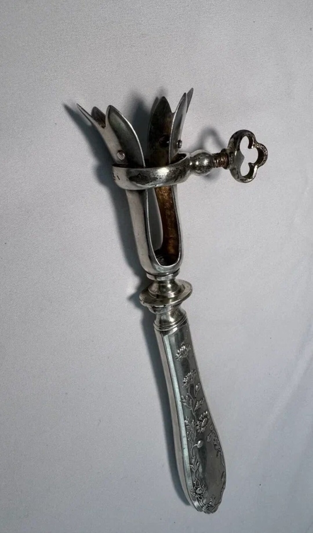 Манш-а-жиго, французский прибор для нарезки мяса на кости, занимал почётное место на столах знати. Изготовленный из серебра, этот зажим служил для сервировки крупных кусков запеченного мяса: бараньей ноги, окорока или косули. Он надежно фиксировал кость, позволяя повару или хозяину дома аккуратно нарезать мясо и подавать его тонкими ровными ломтиками, не лишенными сока. Манш-а-жиго исключал необходимость крепко держать кость рукой, благодаря чему весь процесс становился более эстетичным.