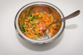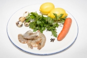 Желатин в листах замачиваем на полчаса, отвариваем креветки. Рыбный бульон доводим до кипения, прощаемся с морковью, луком, сельдереем, лавровым листом и солью, кидаем их в кипяток и варим четверть часа. Процеживаем, добавляем белый перец, желатин, нагреваем, помешивая, пока он не растворится. Кладем на дно формы по креветке, чередуя с морковью, яйцом, горошком. Вливаем бульон, даем остыть, потом прячем в холодильник. Делаем икру из лимона, моркови и зелени: оливковое масло охлаждаем в морозилке до густоты, из шприца капаем в масло сок плодов и зелени (по 50 г и 3 г желатина). Вновь охлаждаем масло 5–10 минут и цедим икру через сито.