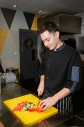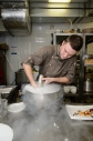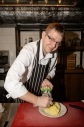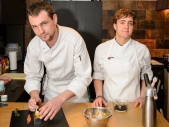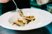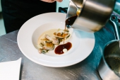 Фермерского цыпленка отвариваем в сувиде — в пакете, откуда выкачан воздух. Затем жарим его с обеих сторон по 1–2 минуты с солью и перцем. Артишоки тоже варим в сувиде, потом растираем их с оливковым маслом, розмарином и чесноком. Фуа-гра, крем из трюфеля, сливки и куриный бульон взбиваем в пенку, которой заливаем птицу. Для полноты картины — тушенные в сливочном масле вешенки и кресс-салат.
