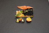 Варим картофель с шафраном, морковь с кориандром, припускаем в оливковом масле горошек. Картофель, морковь и дегидрированные томаты с тимьяном измельчаем кубиками, все смешиваем и выкладываем на тарелку, покрыв слоем икры. Шафрановый айоли, домашний чесночный майонез, для заправки пропускаем через сифон и азот. Сервировать оливье можно с желе из шампанского с пищевыми цветами (их выращивают без химических удобрений) и подкопченным перепелиным яйцом с цветочной солью — смесью высушенных цветов и морской соли.