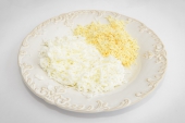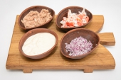 Картофель, морковь, желтки, белки и замороженное масло по отдельности натираем на мелкой терке, лук нарезаем кубиками, безжалостно разминаем вилкой тунца. Ради соуса выжимаем сок из мандарина и смешиваем с майонезом. Выкладываем салат слоями, смазывая каждый соусом: последовательно картофель (немного подсолив), морковь, лук, тунец, масло, белок, краб и желток.