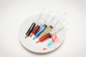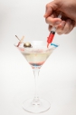 Каждый из ингредиентов, кроме шампанского, смешиваем с альгинатом натрия и набираем в одноразовый шприц, как будто собираемся делать укол. В замороженный бокал для мартини льем шампанское. Выпускаем содержимое каждого шприца в раствор хлорида кальция, ловим получившиеся цветные шарики ложкой с отверстиями и опускаем их в бокал. Можно украсить вишенкой, вымоченной в коньяке, и посыпать золотой пылью.