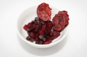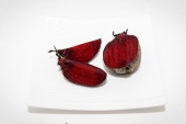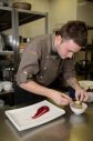 Запекаем свеклу в золе девять долгих часов в остывающей печи. Разбираем филе сельди, кидаем на него морской соли и на два часа оставляем его знакомиться с укропом, красным луком, чесноком, оливковым маслом и соевым соусом. В миску с печеной свеклой радостно плещем апельсиновый сок, полученную смесь взбиваем и протираем. Глазируем в сахаре морковь с тимьяном и чесноком. Картофель запекаем в фольге с чесноком и лавровым листом. Для соуса смешиваем горчицу, растительное масло, уксус, сахар, соль, перец и пюре из печеной свеклы, взбиваем все ингредиенты. Украшаем блюдо листьями свеклы, слайсами редиса, горошком и сорбетом из огурца.