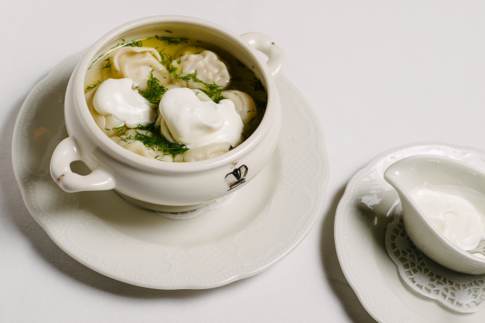 Кроме оленины с брусничным соусом и запеченным молодым картофелем в ресторане «Царь» готовят пельмени с мясом цесарки, грибами и пряными травами в бульоне. Рецепт был изобретен для императора Александра III, правда бульон тогда сварили из петуха. В «Царе» из грибов берут боровики, из трав — розмарин.