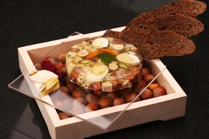 Блюдо в пятизвездочном отеле «Кемпински Мойка 22»— просто гимн локальности. Сам зверь — от поставщика, который охотится в Талецком охотхозяйстве на границе Ленинградской и Новгородской области. Лесные орехи — из леса под Псковом. Желатин не используется, заливное густеет за счет особого способа приготовления бульона. Мясо кабана готовят четыре часа, затем еще час — само заливное, потом в холодильник - на ночь.