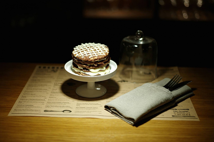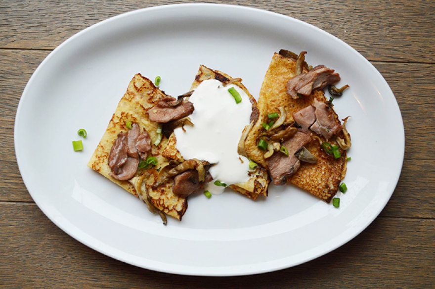 Шеф-повар Игорь Гришечкин не устает экспериментировать. В масленичном меню, во-первых, многослойный торт из ржаных оладьев и куриной печени с сырным муссом. Во-торых, розовые гречневые блины на свекольном соке с начинкой из тушеного лука-порея с хрустящими икринками мойвы и вареным яйцом. В-третьих, блины из полбяной муки с фрикадельками, солеными огурцами с копченым сулугуни и хрустящими луковыми кольцами. На десерт предлагают тонкий блинчик с начинкой из заварного крема на топленом молоке с глазированной антоновкой и быстрым вареньем из брусники, обернутый тонким слоем «бумаги» из клюквенного левишника — это такое высушенное ягодное пюре.